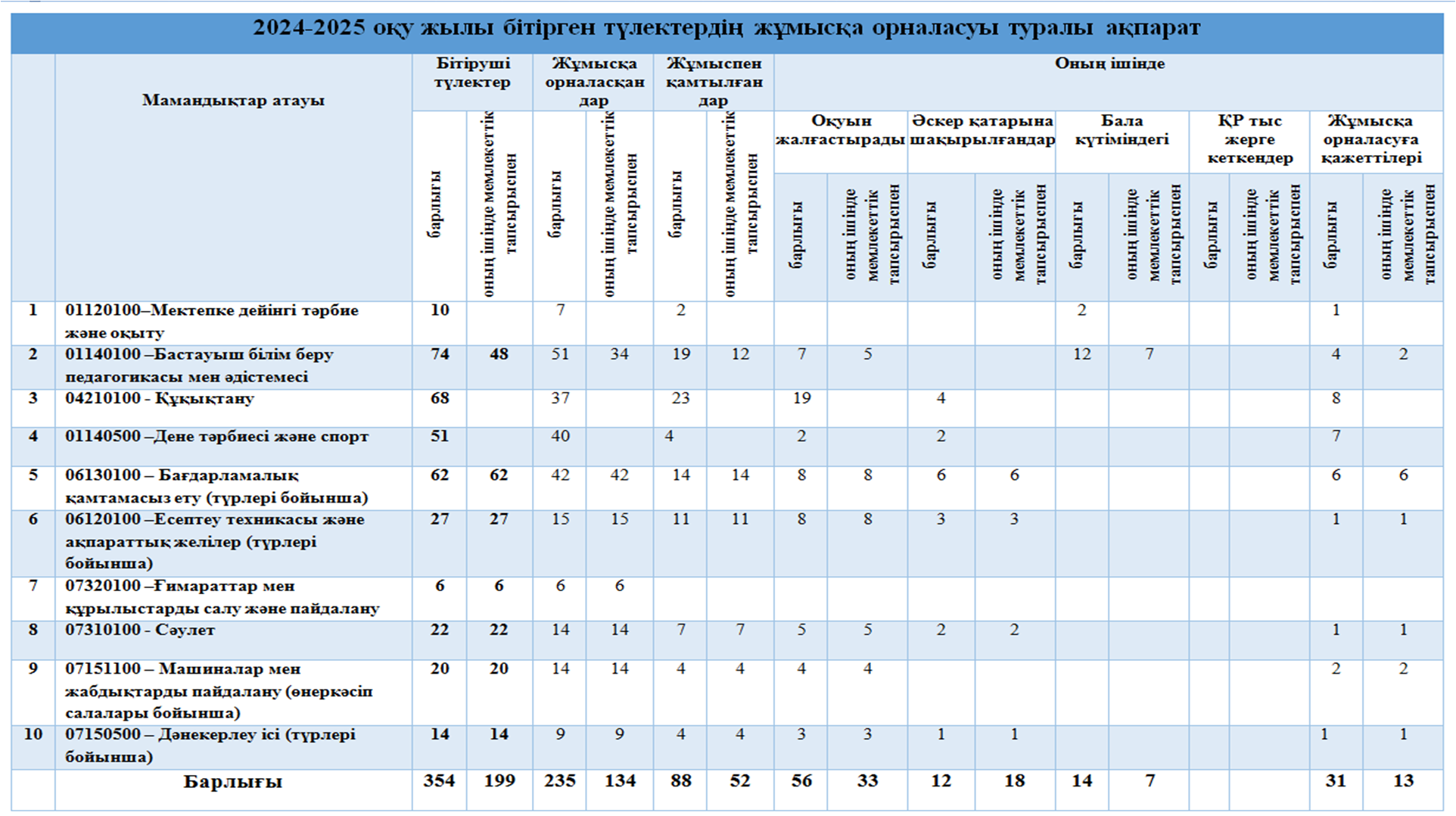 2024-2025 ОҚУ ЖЫЛЫ БІТІРГЕН ТҮЛЕКТЕРДІҢ ЖҰМЫСҚА ОРНАЛАСУЫ