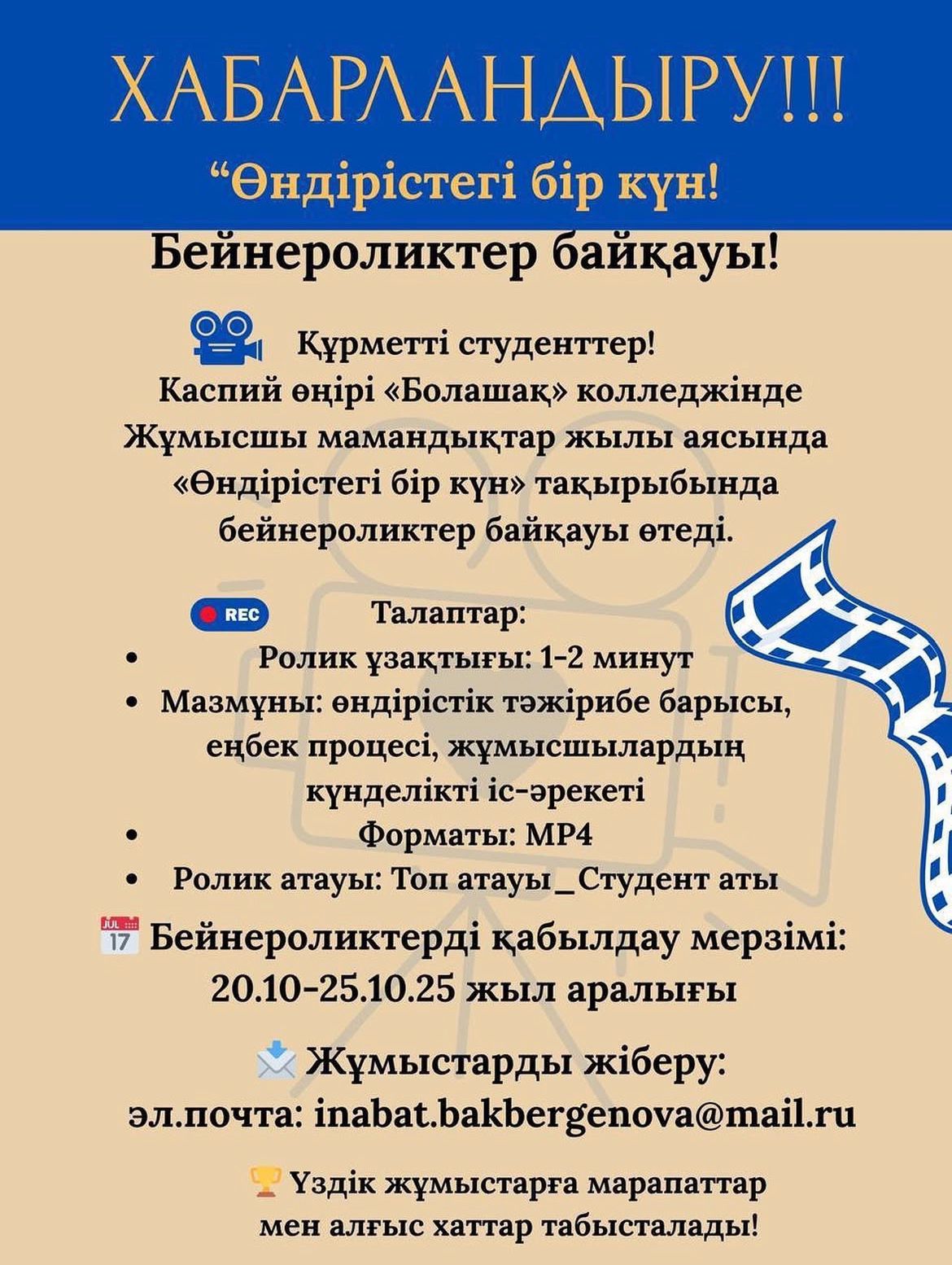 «Өндірістегі бір күн» тақырыбында бейнероликтер байқауы өтеді!