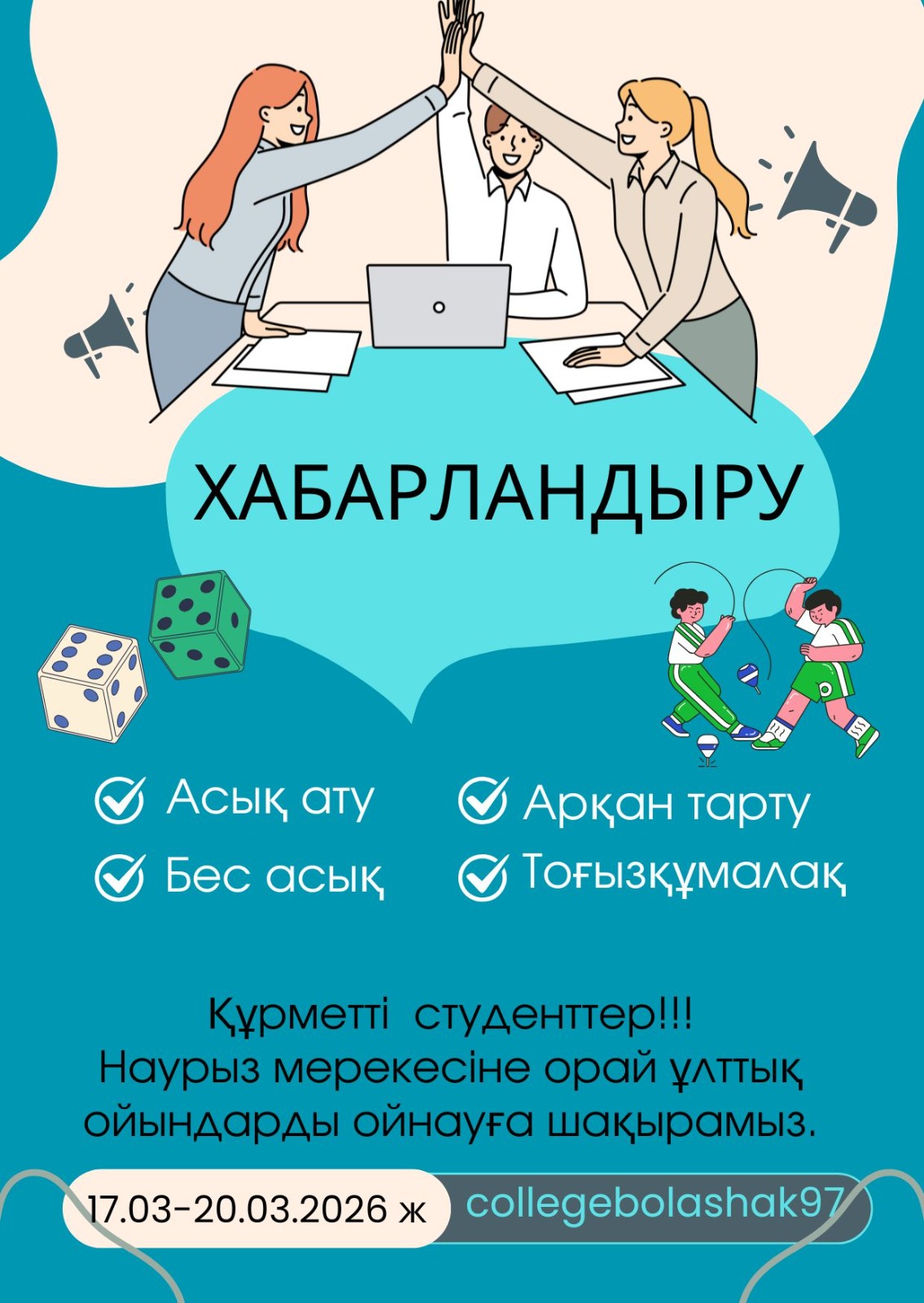 Құрметті студенттер! Сіздерді келе жатқан Ұлыстың ұлы күні – Наурыз мерекесіне орай ұйымдастырылатын ұлттық ойындарға қатысуға шақырамыз!